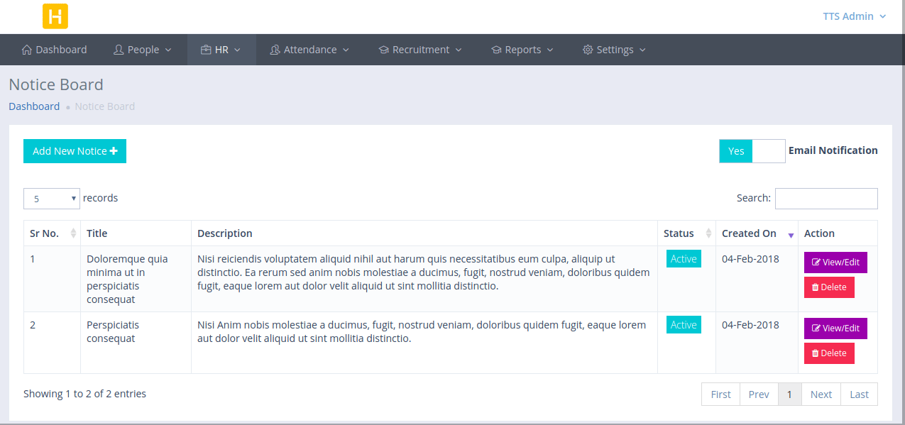 With HRM's notice board feature, you can make company-wide announcements. Notices are visible on employee dashboard and employees are also notified by email.