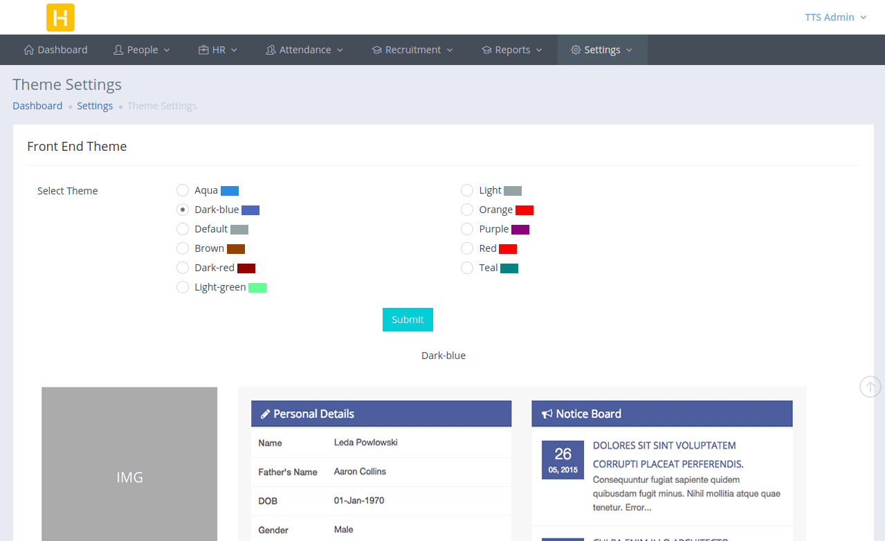 HRM has 11 front end themes. Choose a theme that everyone likes, or the one that blends well with your company logo.